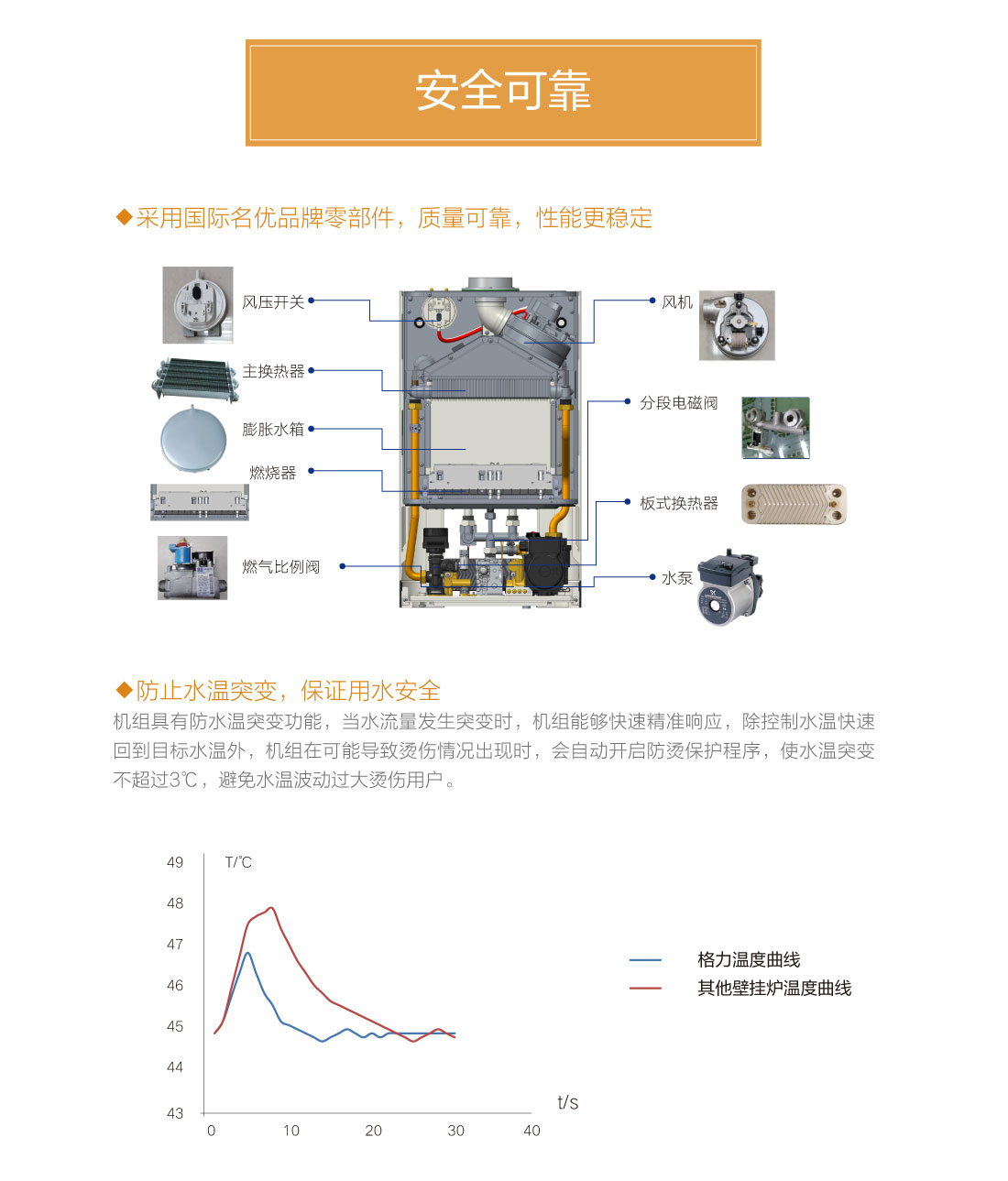 分段燃燒,20%~100%寬域功率輸出,防止夏季水溫過高過燙,智能水溫調節,±0.5℃精準控溫,溫度設定廣,生活熱水35℃~60℃,暖氣片供暖用水30℃~80℃,地暖供暖用水30℃~60℃