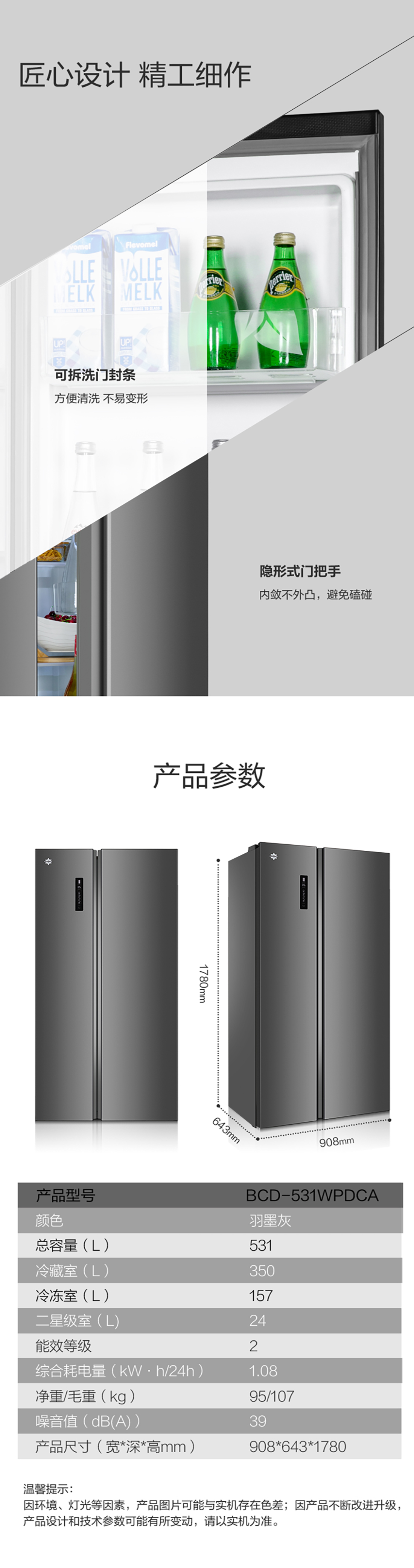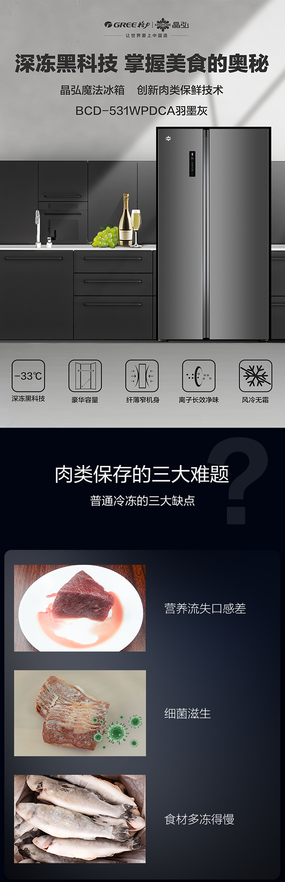 搭載-33℃深凍鎖鮮科技,肉汁飽滿更長久。采用離子長效抗菌凈味,抗菌率高達99.9%。風冷無霜,拒絕風干,食材水潤新鮮。